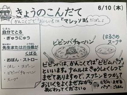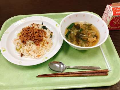 今日は、ビビンバチャーハン、春雨スープ、牛乳です。