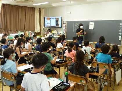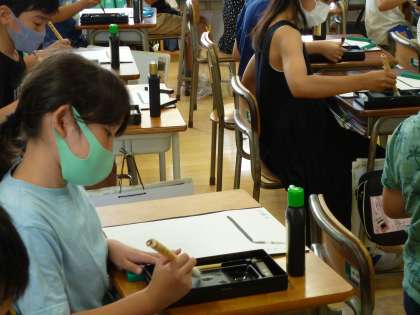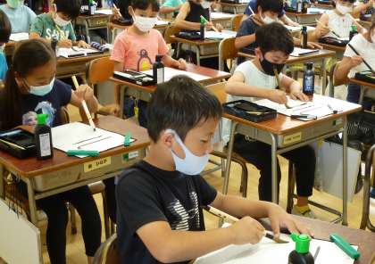 3年生の習字の時間です。「グーペタピン」の良い姿勢を意識しながら、みんな集中して「三」の字を書いていました。