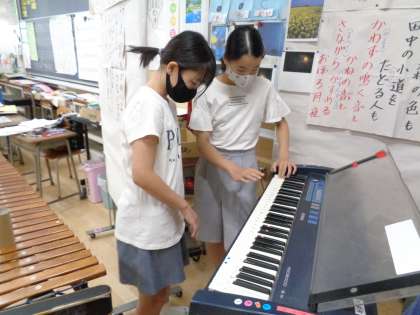 6年生の音楽です。合奏のパート決めや担当の楽器の練習をしていました。
