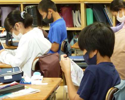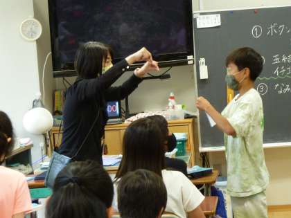 ボタン付けのやり方を学びました。先生の説明が、手元のタブレットでも確認できます。みんな真剣な様子で針を動かしていました。先生にもすすんで聞きに行くなど熱心です。