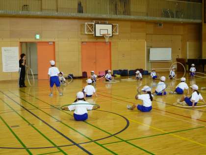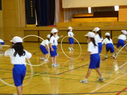 フラフープを使って、転がしたり、くぐったりして遊びました。