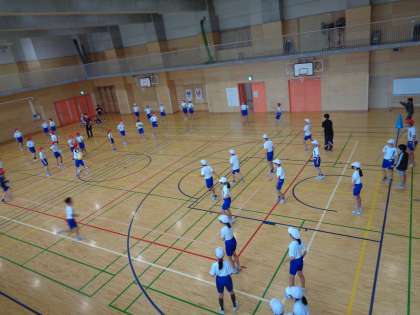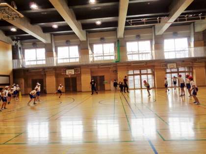 クラス対抗でドッジボールを行っていました。ボールを2個使い、やわらかいボールは女子専用ボールです。白熱したゲームでした。