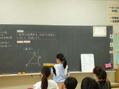 合同な四角形の描き方を説明し、黒板に丁寧に作図していました。