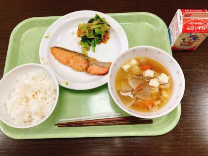 今日は、ごはん、鮭のねぎみそ焼き、野菜のおひたし、けんちん汁、牛乳です。