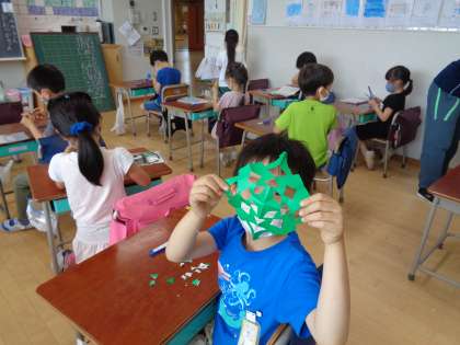 1年生の図工「チョッキン パッでかざろう」です。