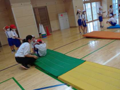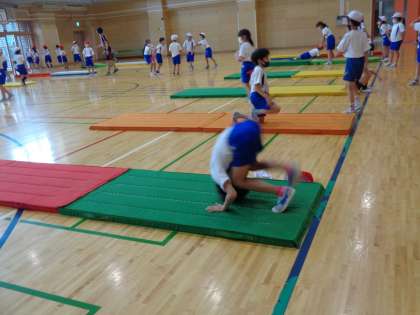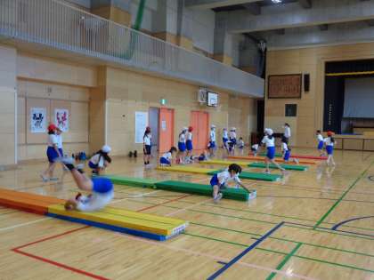 前転や後転に取り組んでいました。細いマットや坂道のあるマットなど自分の課題は何か考えて、選んでいました。どんどんチャレンジして、技能を高めていました。