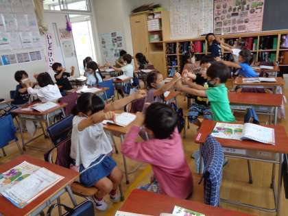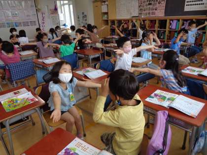 1年生の音楽です。「かたつむり」の歌をリズムに乗りながら歌っています。
