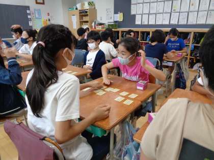 6年生の日本語です。百人一首のかるたをしていました。
