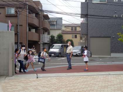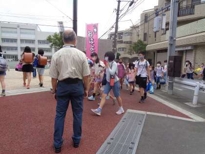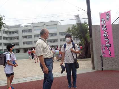 遠足に行く5年生が校長先生と楽しそうに話していました。