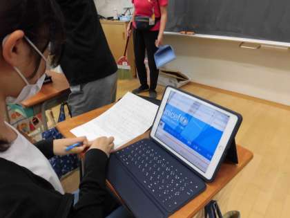 国際理解委員会の様子です。タブレットや本で調べて「水と衛生」「世界の子ども達の様子」など様々なテーマをもってポスター作りをしました。どの子も真剣です。低学年でも分かりやすいように、表現の仕方を工夫していました。