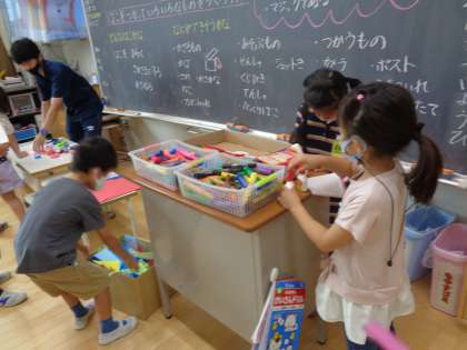 1年生の図工「わくわくボックス」です。家から持ってきた空き箱を何かに見立てて変身させます。ロケット、さかな、バッグ・・・