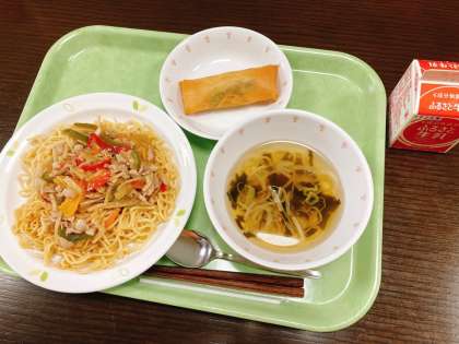 今日は、青椒肉絲焼きそば、もちもちロール、ねぎとわかめのスープ、牛乳です。