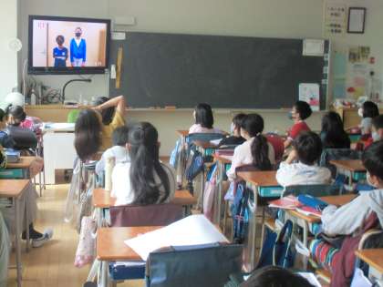 コロナウイルスの感染予防の観点から、全校児童が体育館に一堂に会することはできませんが、どのクラスでもテレビ画面を見て、心を1つに山野小の開校記念日をお祝いしました。