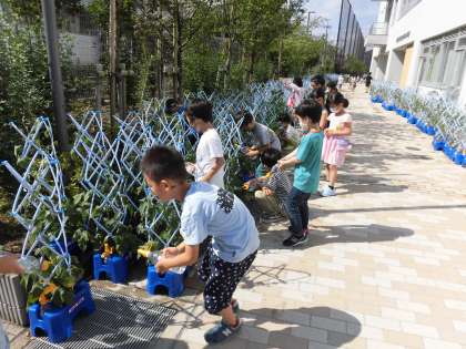 1年生が朝顔を育てています。朝から日が強く差していたためか、葉もぐったりしていました。その様子を見て、自分の鉢植えだけでなく友達の分も懸命に水やりをしていました。とても微笑ましい姿でした。