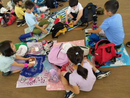 お弁当、おやつ、どれも美味しそうなものばかり。グループごとに「いただきます」を言ってなかよく食べていました。