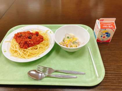今日は、なすのボロネーゼスパゲッティ、ツナとコーンのサラダ、牛乳です。