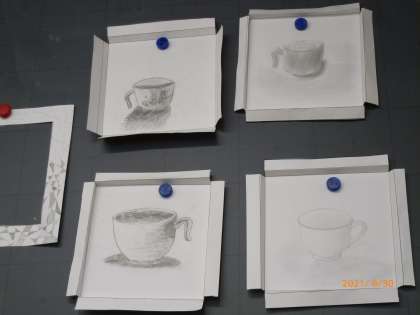 まず、コーヒーカップをよく見ながら画用紙に形を描いていき、その後光の向きを意識しながら明暗をつけていきました。