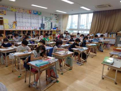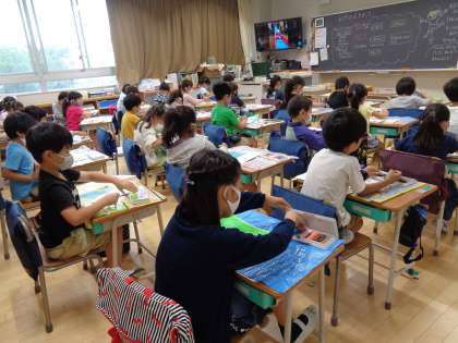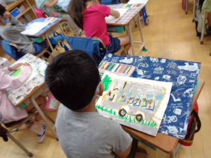 1年生の図工です。遠足の思い出を絵で描きました。たくさんある思い出の中から一番楽しかったことを描きました。絵を描くことに夢中になっていて、話し声が一切ありません。遠足の思い出に浸りながら、絵を描くことを楽しんでいました。