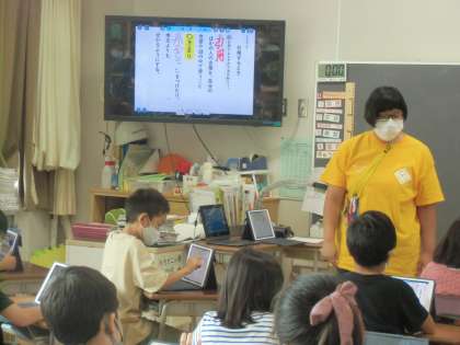 この学級では、ワークシートを紙では配らず、タブレットで配っていました。子供たちはタブレット上でワークシートに書き込みます。