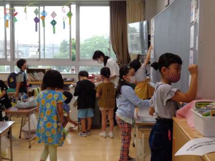 1年生の教室の様子です。登校してきて、友達との会話がはずんでとてもたのしそうでした。