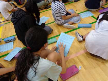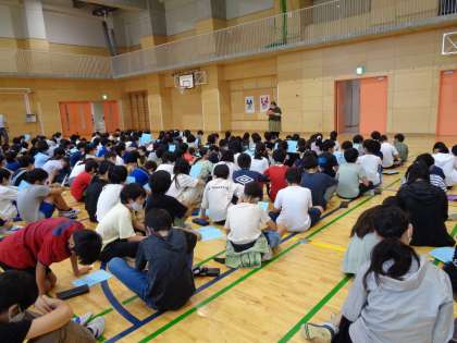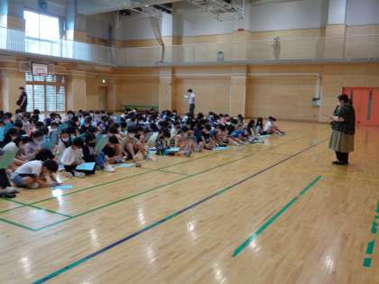 体育館では、5年生が社会科見学のオリエンテーションを行っていました。