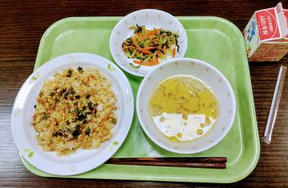 今日のメニューは七夕ちらしずし、五色のおひたし、天の川すまし汁、牛乳です。七夕のスペシャルメニューですね。