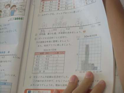 平均値、最頻値、中央値など、これまでに学習してきた見方を生かしたり、度数分布表に表してその特徴を読み取ったりするなど、データの分析法を学んでいます。