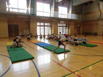 これまで、練習した成果を皆の前で披露していました。開脚前転、後転など