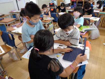 自分が飼いたい生き物について、調べています。タブレットや図鑑など調べる手段も自分で選んでいます。
