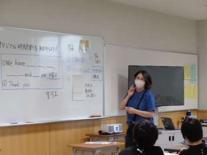 5年生の外国語です。自分で作った時間割の発表会をしていました。