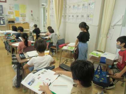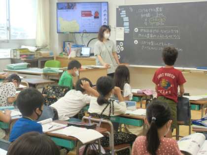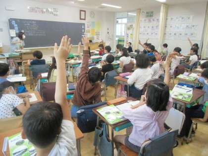 世田谷区では、ぶどう農家がここ数十年で増えているそうです。その理由について、みんなで考えました。思いついたことを発表したくて、たくさんの手が挙がっています。手を挙げていない子も、ノートに予想をしっかりと書いていました。