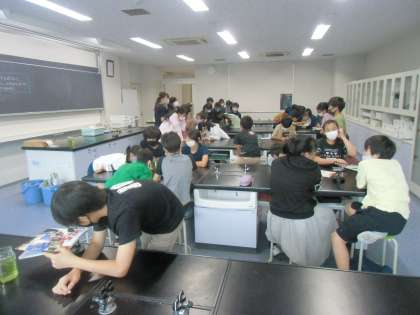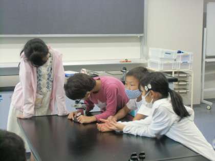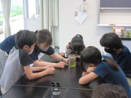 「あれ、よく見えないよ。」「光が足りないんじゃない?」などと、グループで話しながら、顕微鏡の使い方に慣れ親しんでいました。