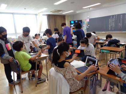 さっそく、テーマごとのグループに分かれて、タブレットを使って調べていました。