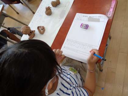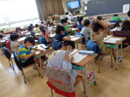 教室に戻って、振り返りカードに、自分のがんばったところや工夫したところ、また、友達のよかったところなどを書きました。