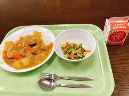 今日は、チキンカレーライス、海藻サラダ、牛乳です。