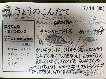 「今日のチキンカレーは、どこで作ったの?」と、聞かれたら、何と答えますか?キチンとした答えは「給食室で」ですが、私の答えは「チッキンカレーだから、キッチンで」です。給食室は、大きなキッチンですからね。海藻サラダをいただきながら、昨日の夕食を回想してみたら、カレーライスでした…。