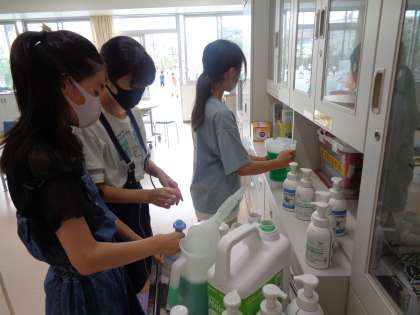 保健室で、保健委員の人たちが、空になった石けんのボトルの詰め替え作業をしていました。