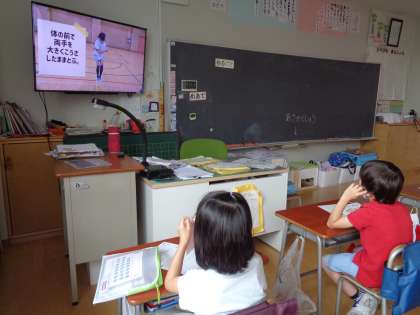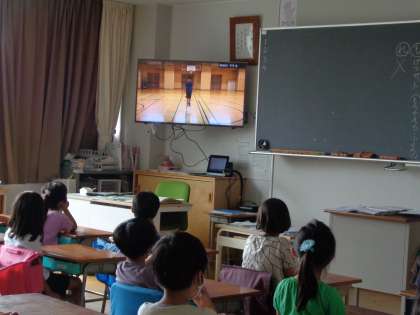 体育委員による体育朝会がありました。今日は、縄跳びのいろいろな跳び方を映像で紹介してくれました。