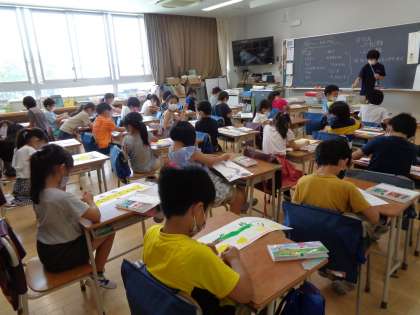 画用紙をたてに置いて、ロケット、キリン、あさがお・・・
