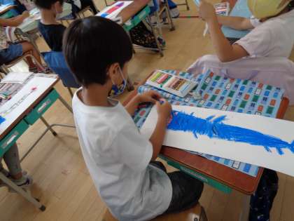 細長い画用紙の形をいかして、クレパスで絵を描きました。
