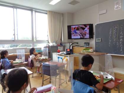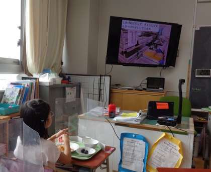 栄養士の先生が、給食室で給食を作っている様子を映像で配信してくれました。