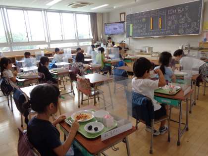 その日の給食がどのように作られているのか、食材に何が使われているのかなど一目瞭然です。大きなお鍋やたくさんの量の食材から、給食室の大変さも伝わってきます。