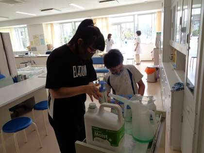 休み時間に保健委員の5年生がせっけんの入れ替えをしていました。