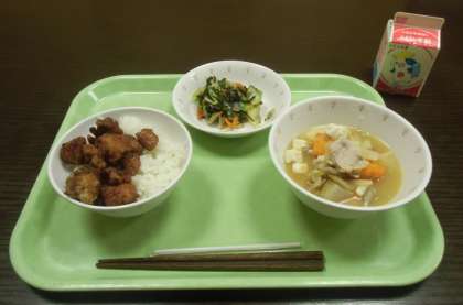 今日のメニューは、ご飯、歯鰹(はがつお)のコロコロ揚げ、野菜の磯あえ、豚汁、牛乳です。