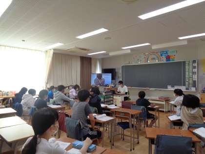6年生では、一人の先生が授業をして、5クラス合同で授業が配信されていました。オンライン授業を受けているAグループの人たちにも配信されています。