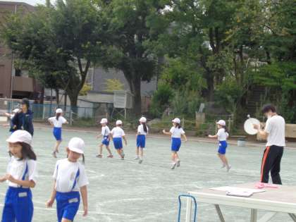 先生の太鼓のリズムに合わせて、線の上を歩いたり、スキップしたり、走ったり・・・