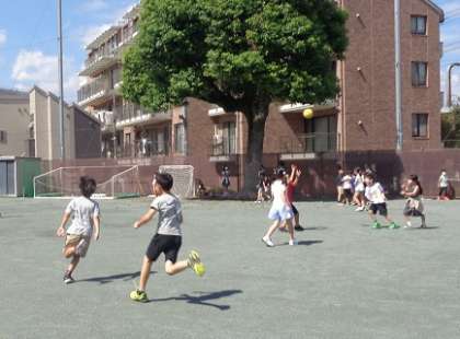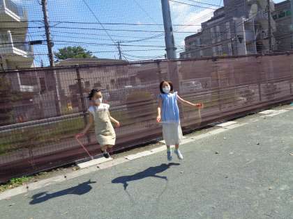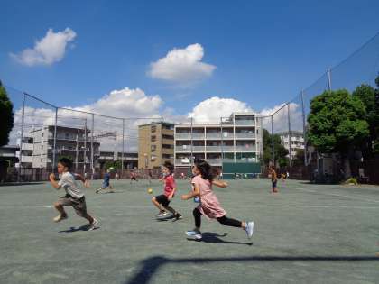 青空の下、元気いっぱいに遊ぶ子供たち。