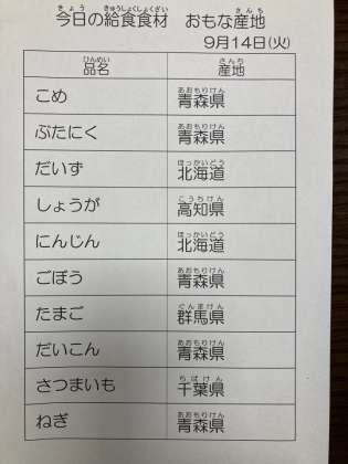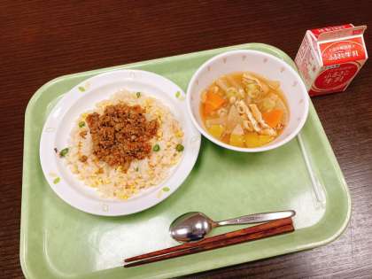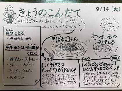 今日は、そぼろごはん、さつまいものみそ汁、牛乳です。