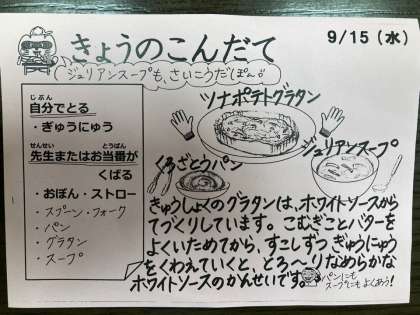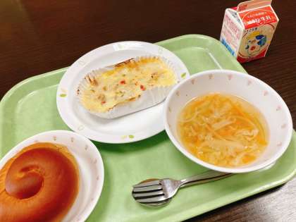今日は、黒砂糖パン、ツナポテトグラタン、ジュリアンスープ、牛乳です。
