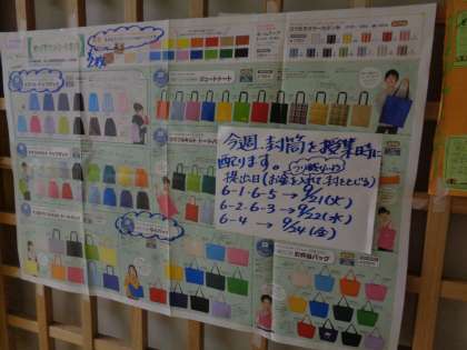 ナップサップ型か、手提げ型か、それぞれの使い道や良さを考えてから、自分で選びました。そして、色や飾りなどを付けてデザイン画を描きました。